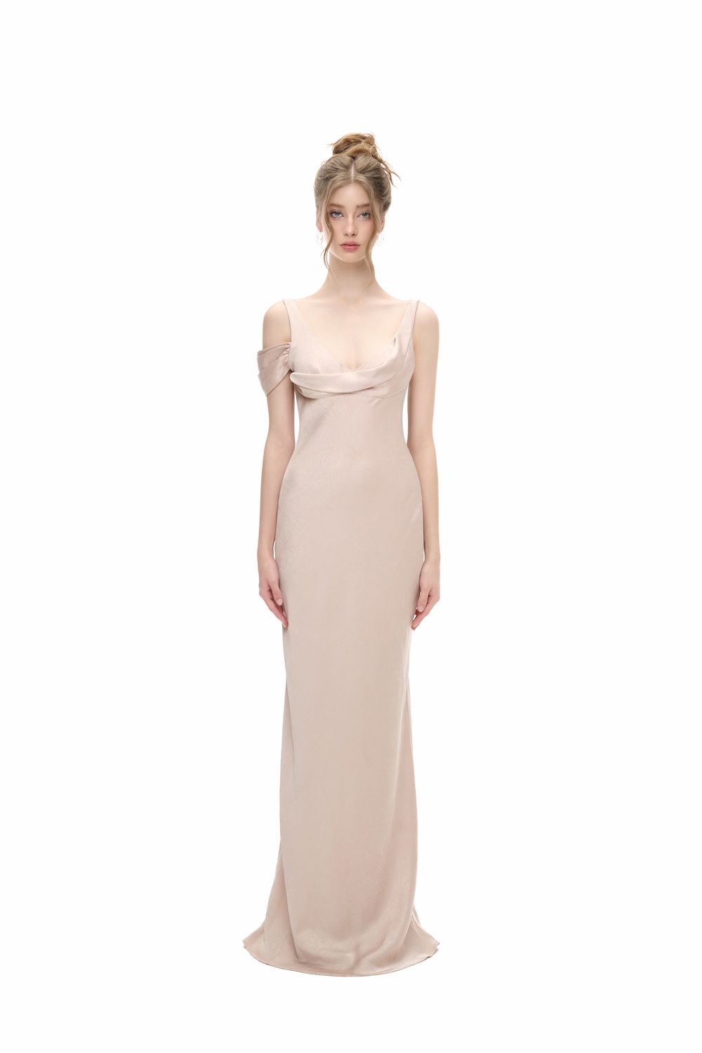 Amoura dress features a draped neckline design, creating an alluring asymmetry. With a floor-length silhouette and a side zipper for convenience, it offers both elegance and practicality. The soft draping at the back adds a graceful flow, while the waist tie cinches at the waist to accentuate the body’s curves in a refined way.