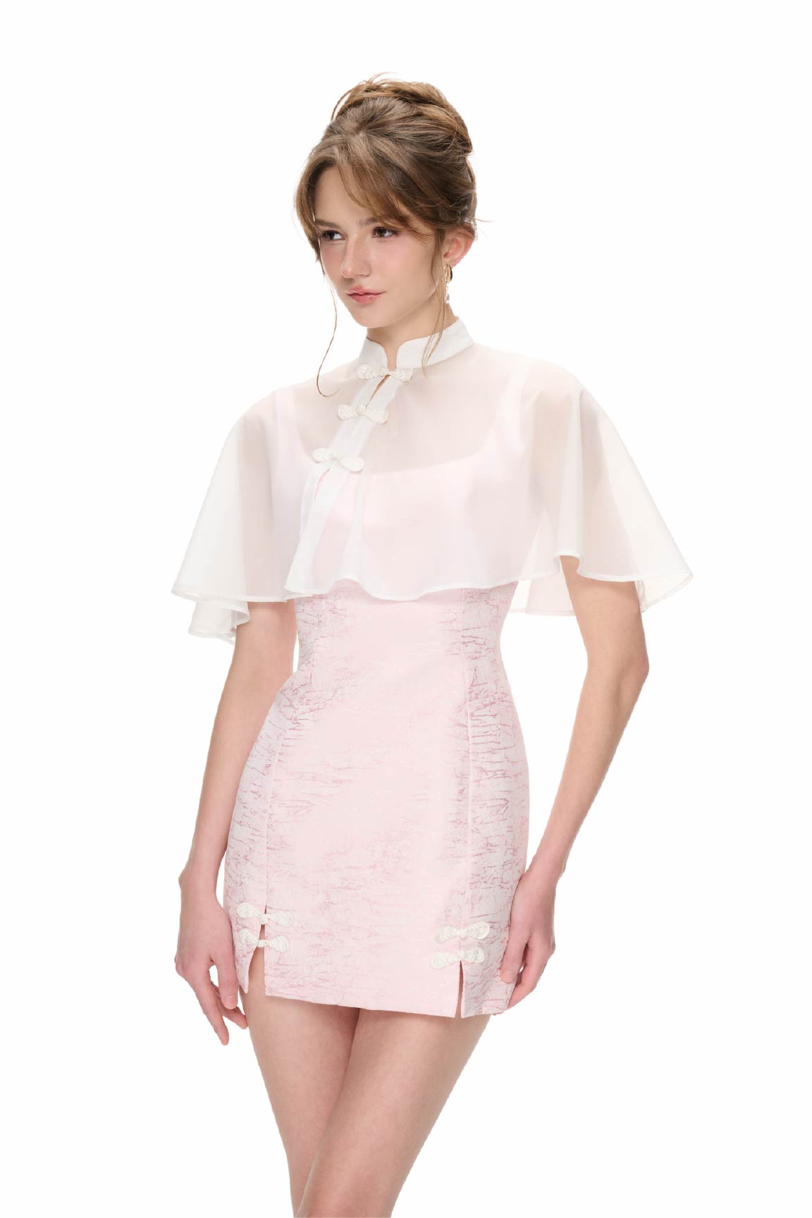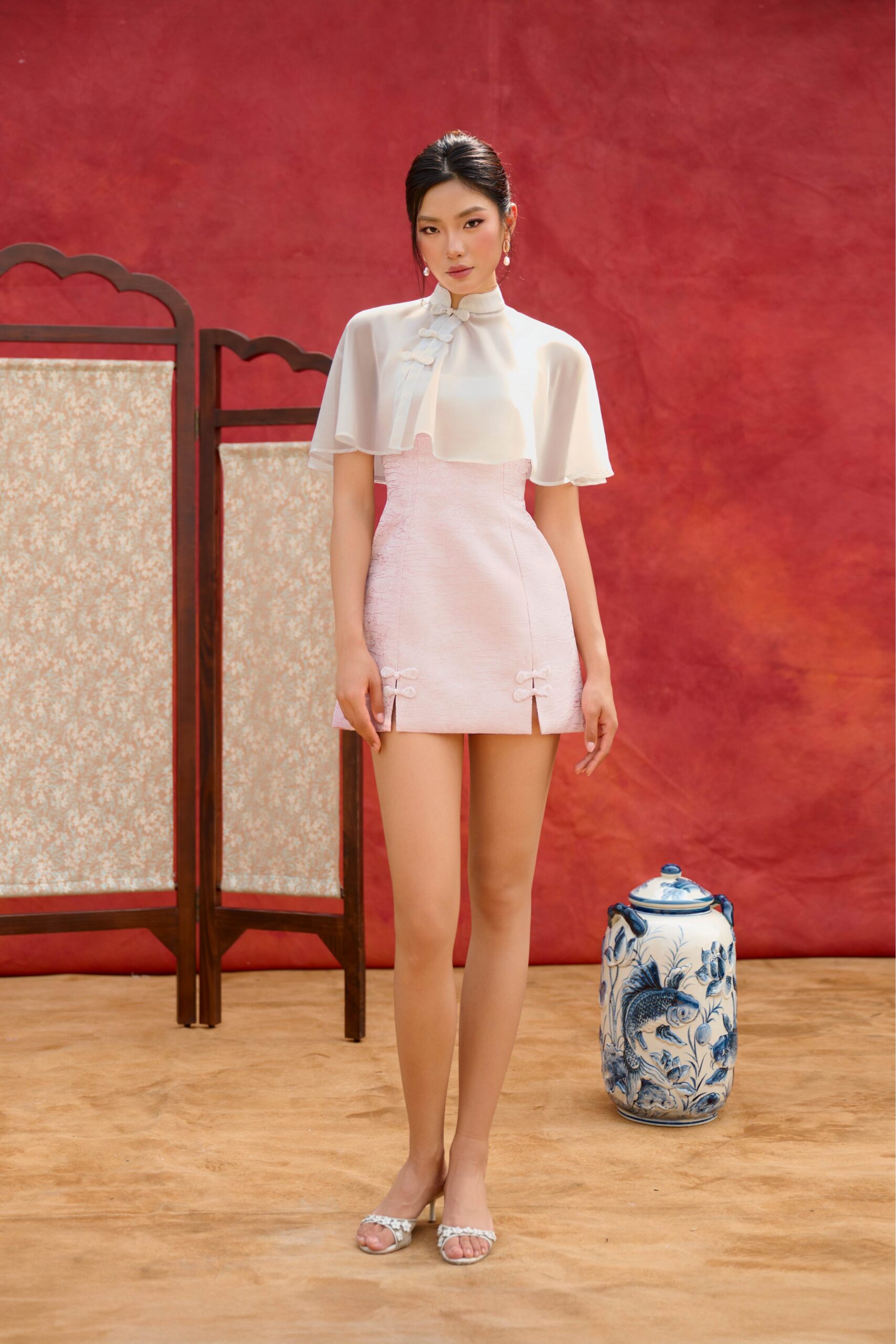 The Bloom Dress unfolds as a layered expression of Modern Indochine elegance. A chiffon cape, drapes softly over the shoulders, accented with three traditional frog buttons for a refined nod to heritage.