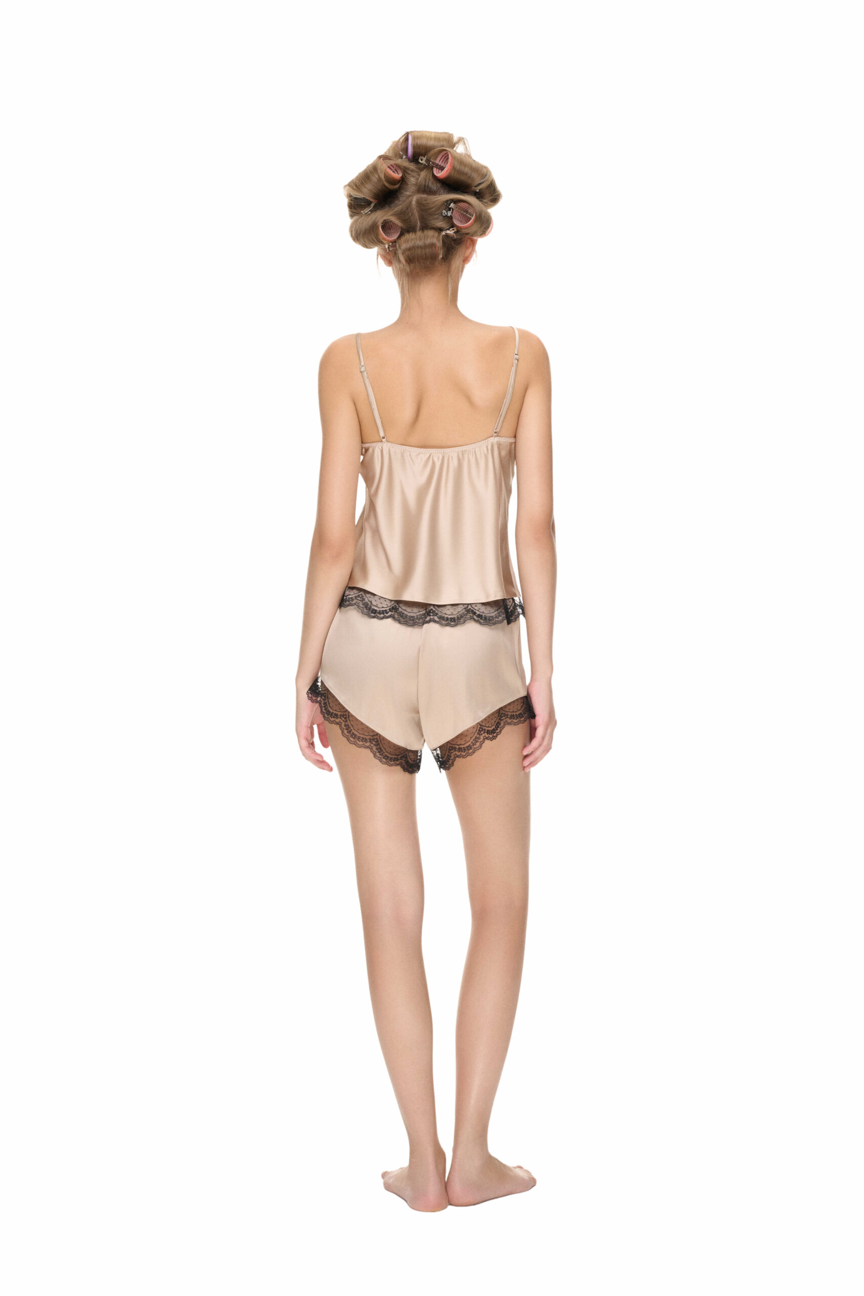 A delicate satin sleepwear set with lace accents.