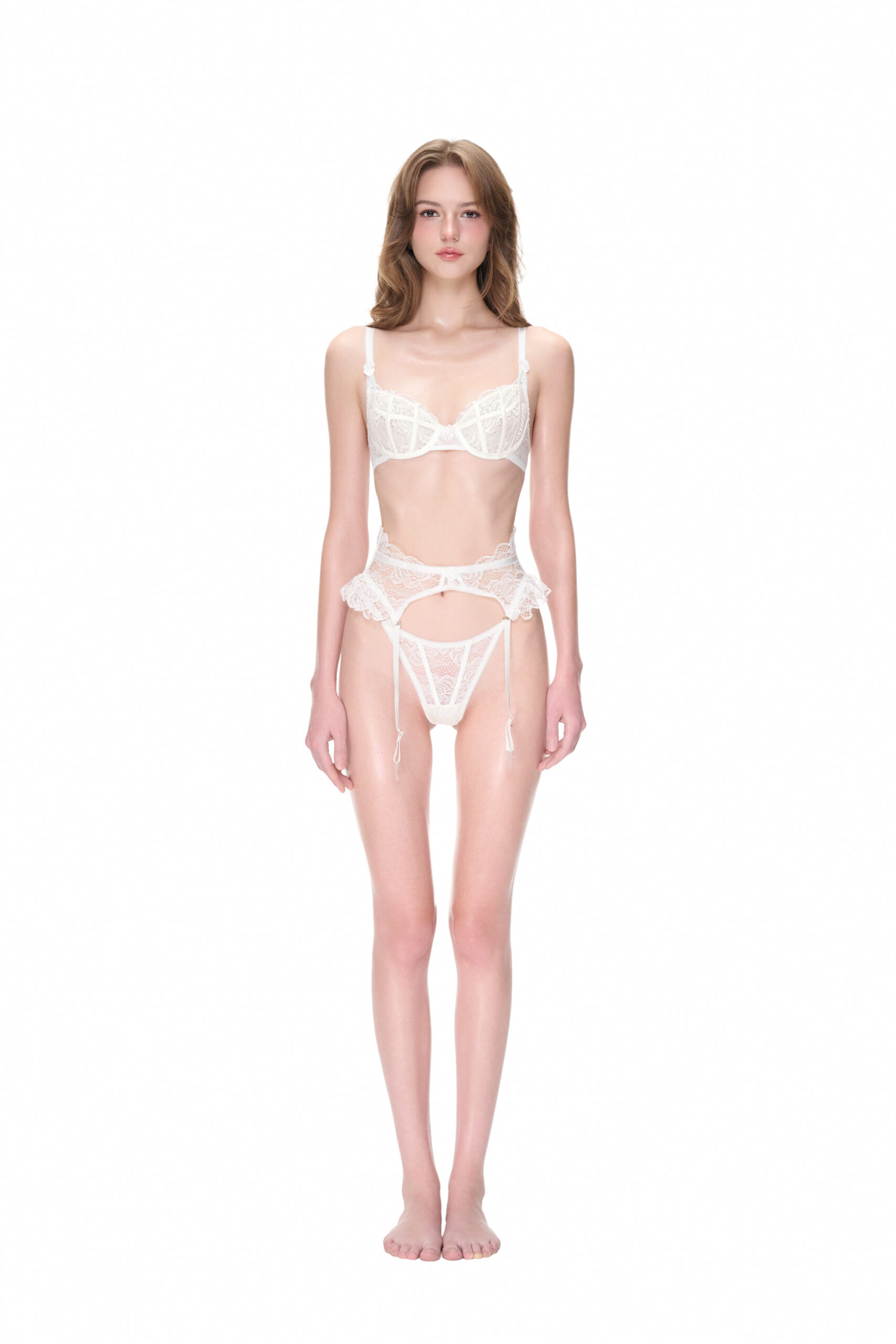 Fleurine Lingerie is a white lace set adorned with subtle shimmering floral accents that catch the light delicately. The structured cups with seam detailing shape the bust with gentle definition, while petite bow accents at the straps and center add a romantic touch. Finished with a ruffled garter belt and an adjustable string brief, Fleurine balances sweetness with quiet allure.