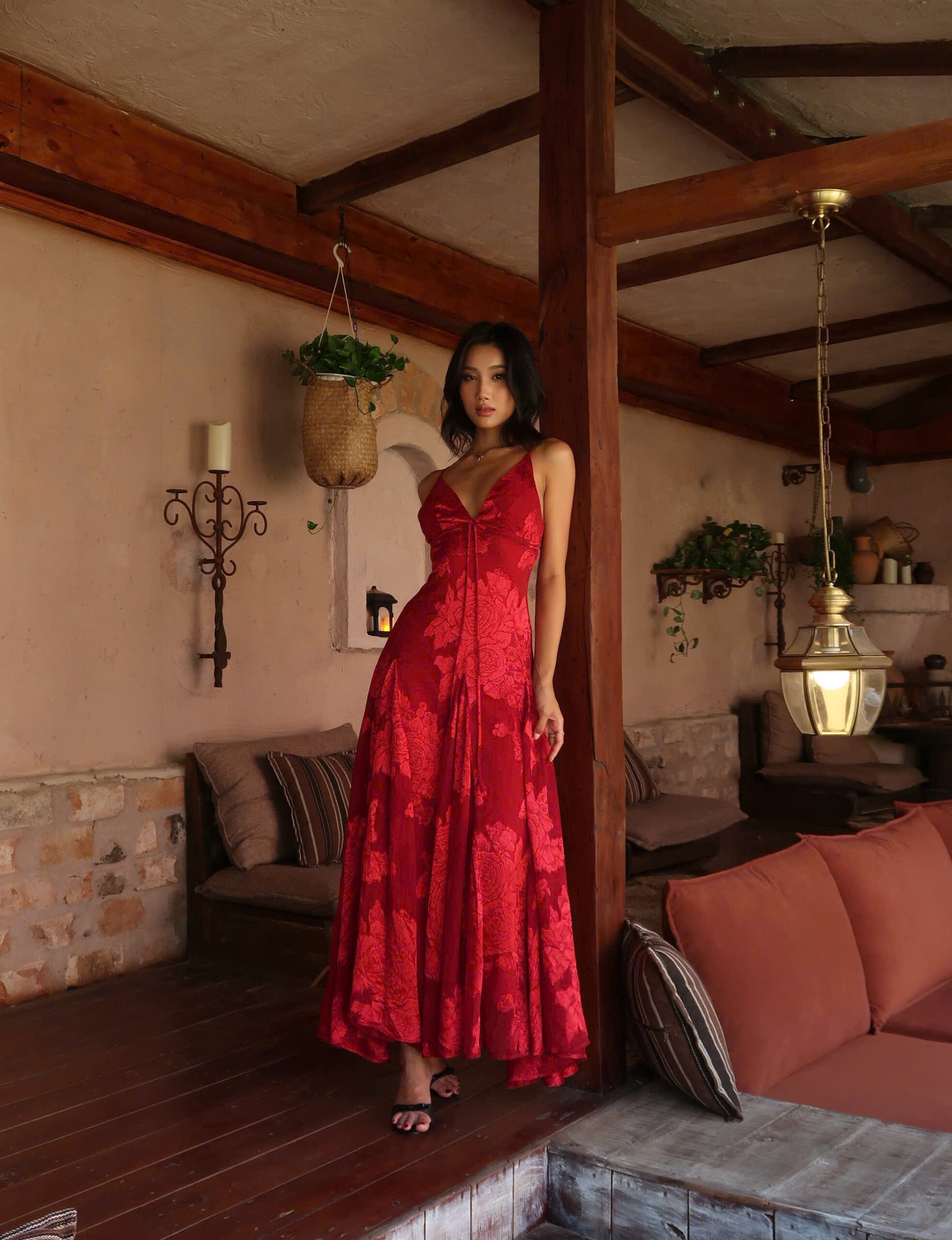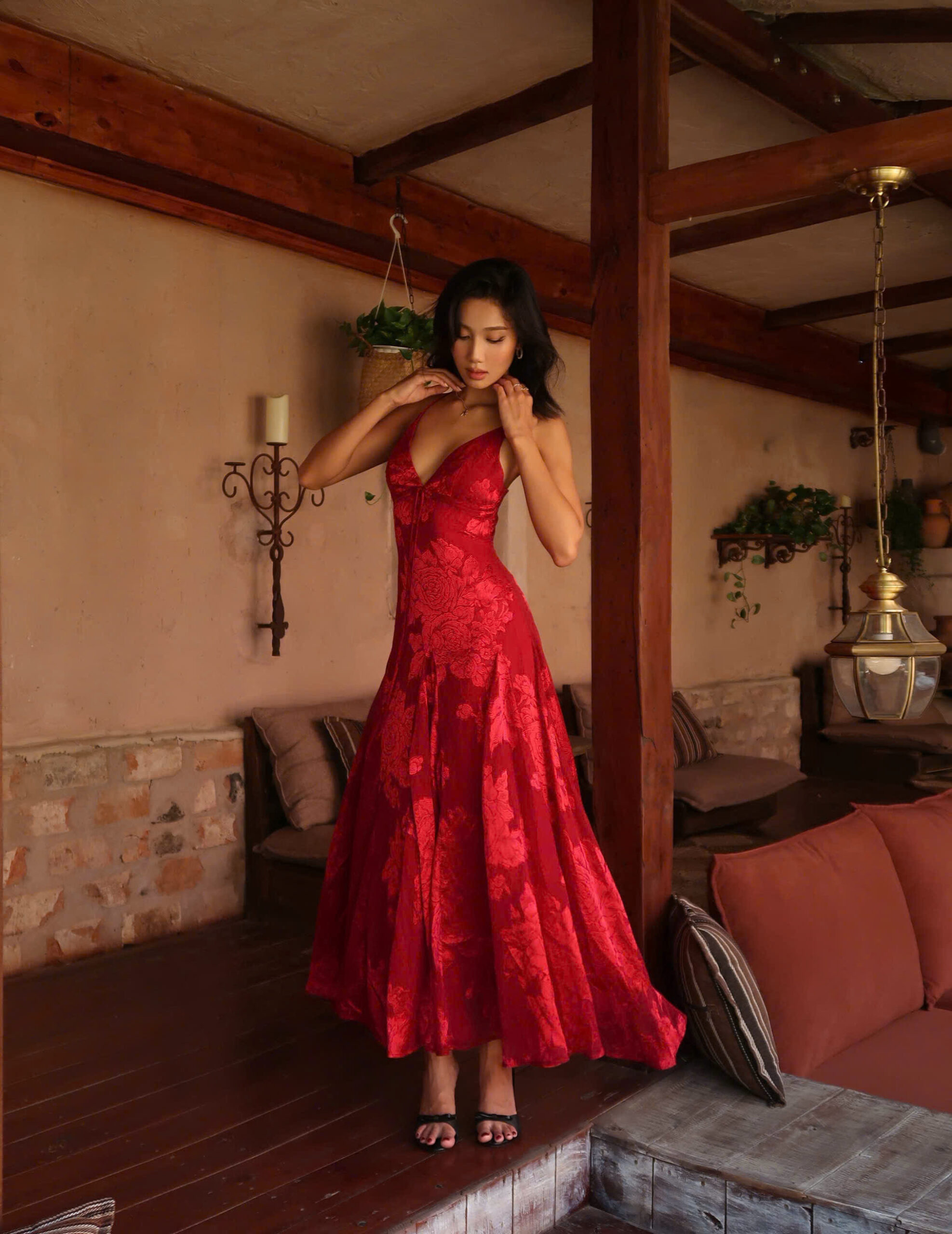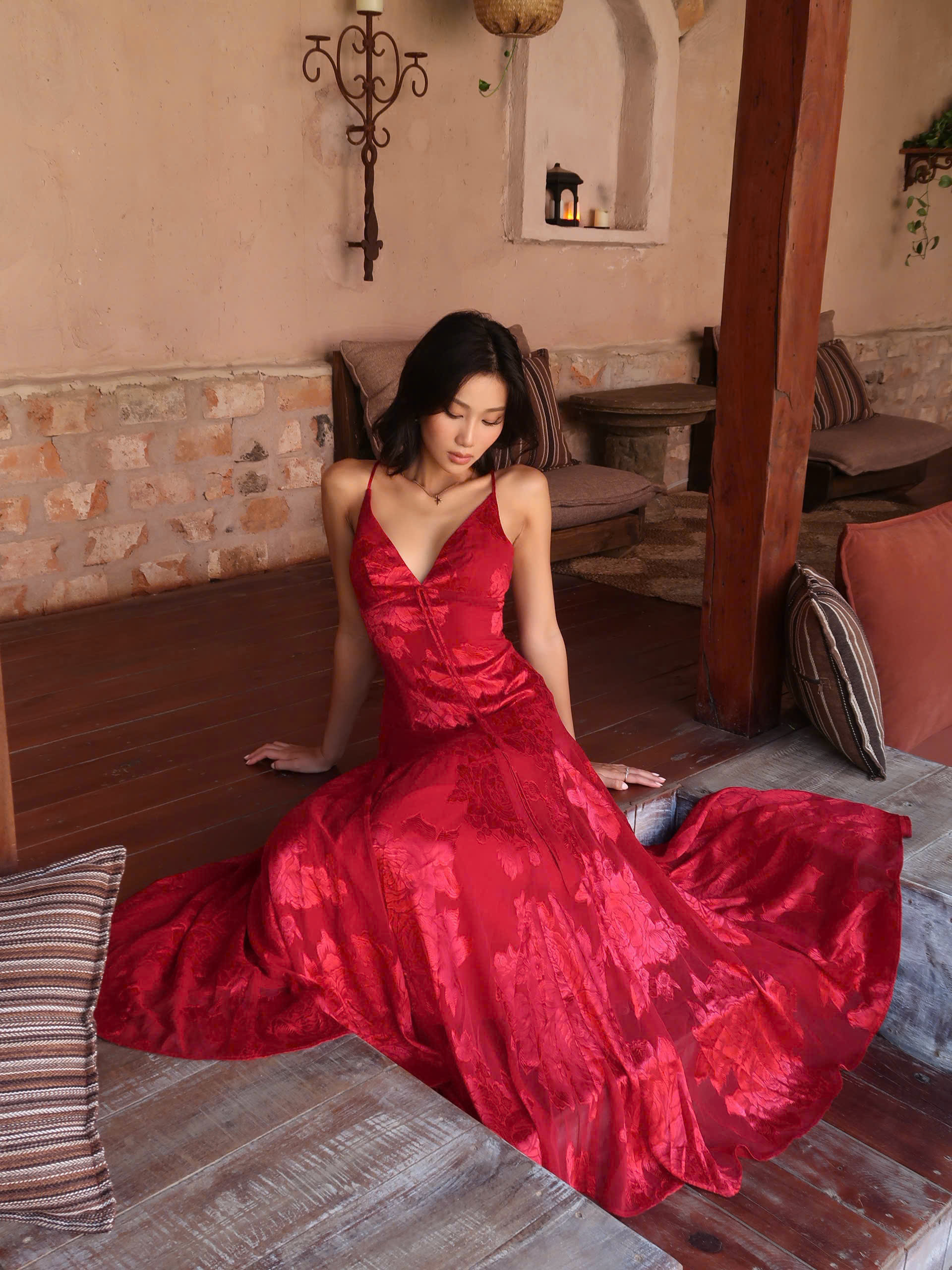 Helena dress Crafted from floral chiffon with a romantic rose print. The bodice features a delicate tie-front detail, adding a feminine touch. With an ankle-grazing length, the skirt is designed with triangular panel inserts made from the main fabric, creating a voluminous and graceful flare. Finished with a back zipper for convenience.