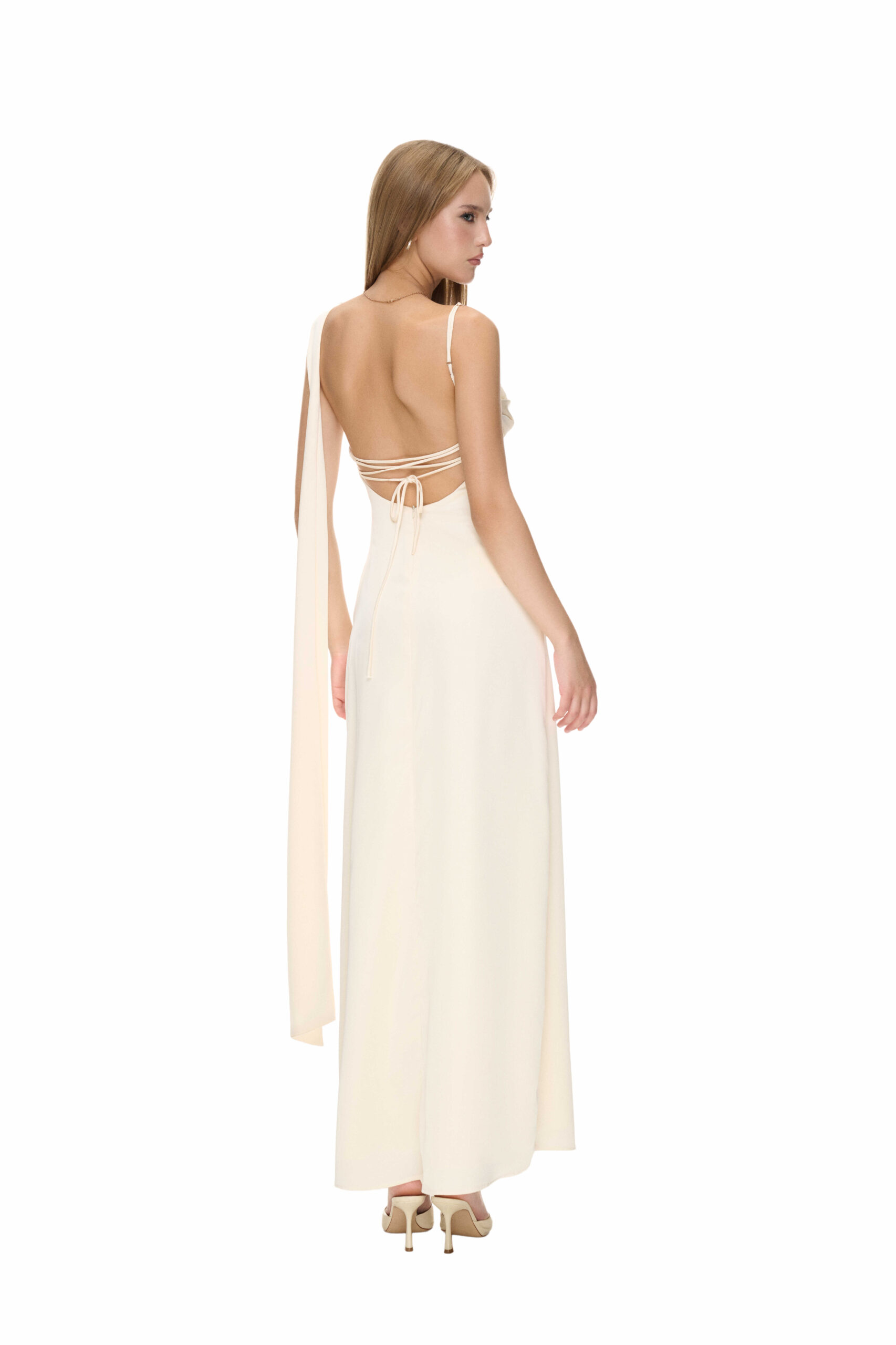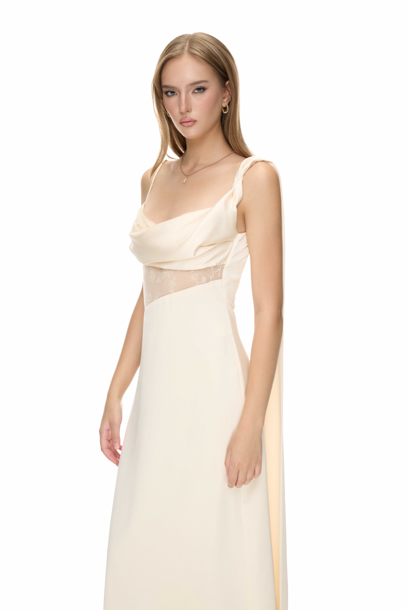 The Lucianna dress, made of fine silk, features a draped cowl neckline that flows beautifully into a softly fitted bodice, highlighting your feminine curves. The subtle floral lace insert at the waist adds a touch of romance, while the sleek, floor-length satin skirt ensures you make a graceful entrance at any event.