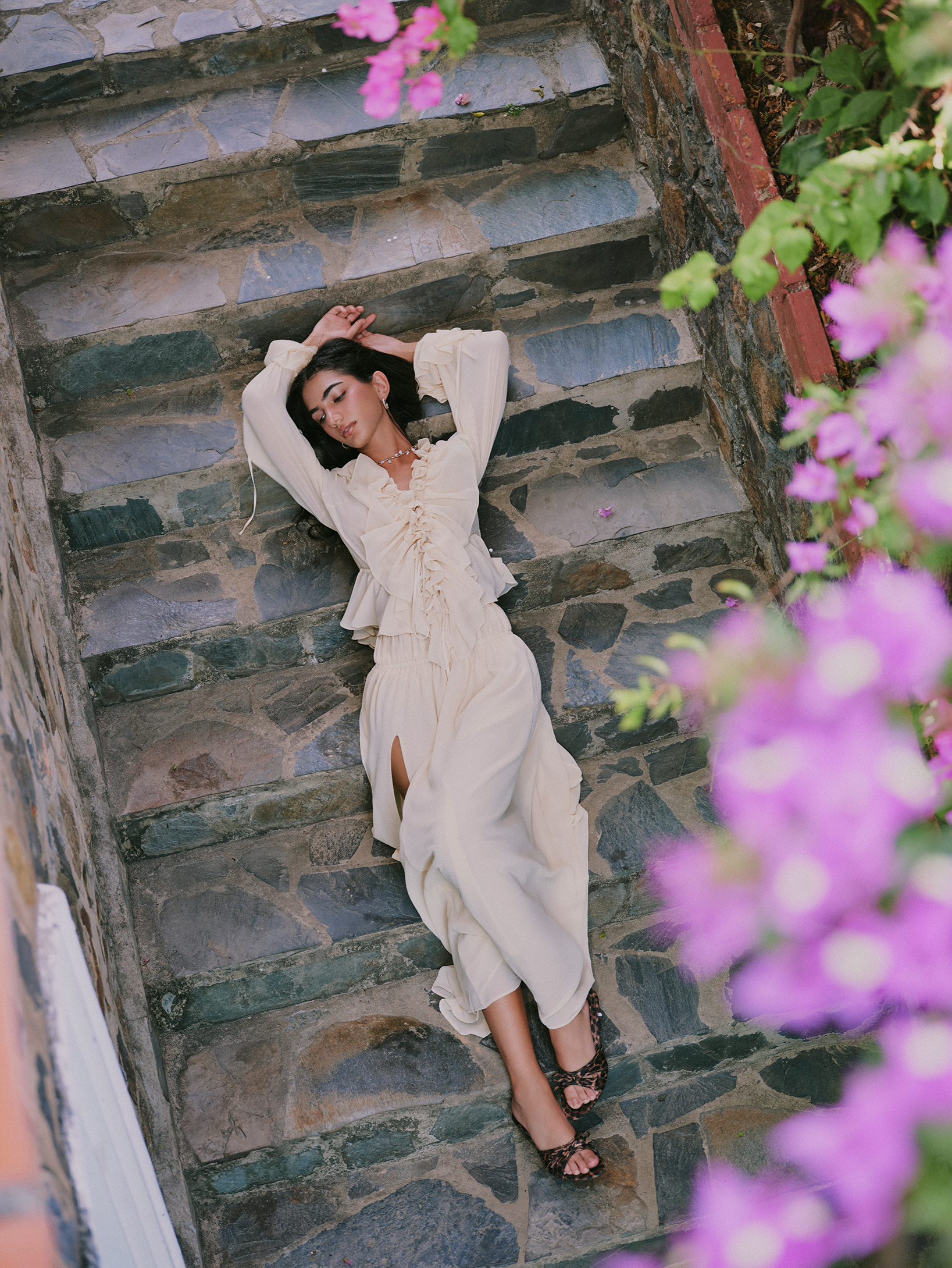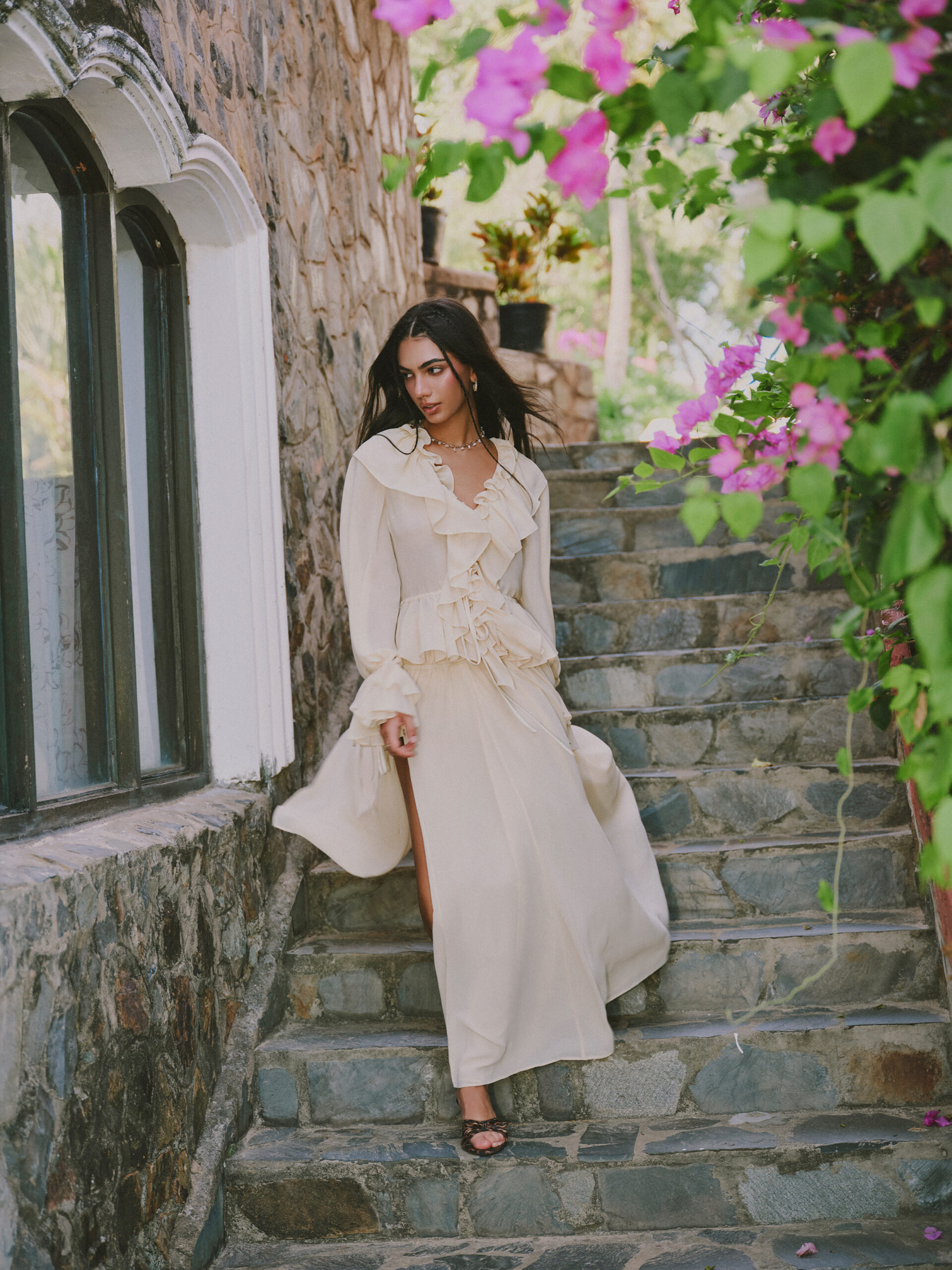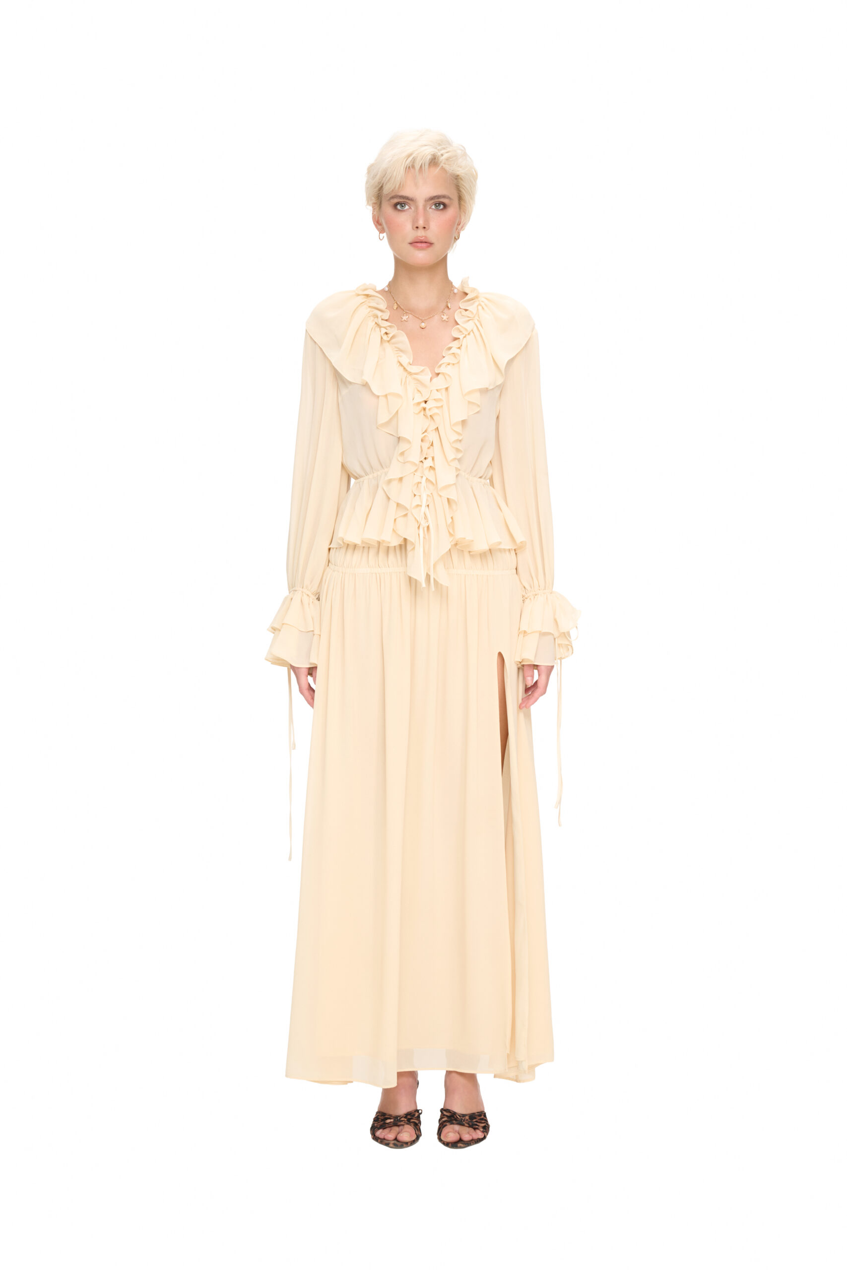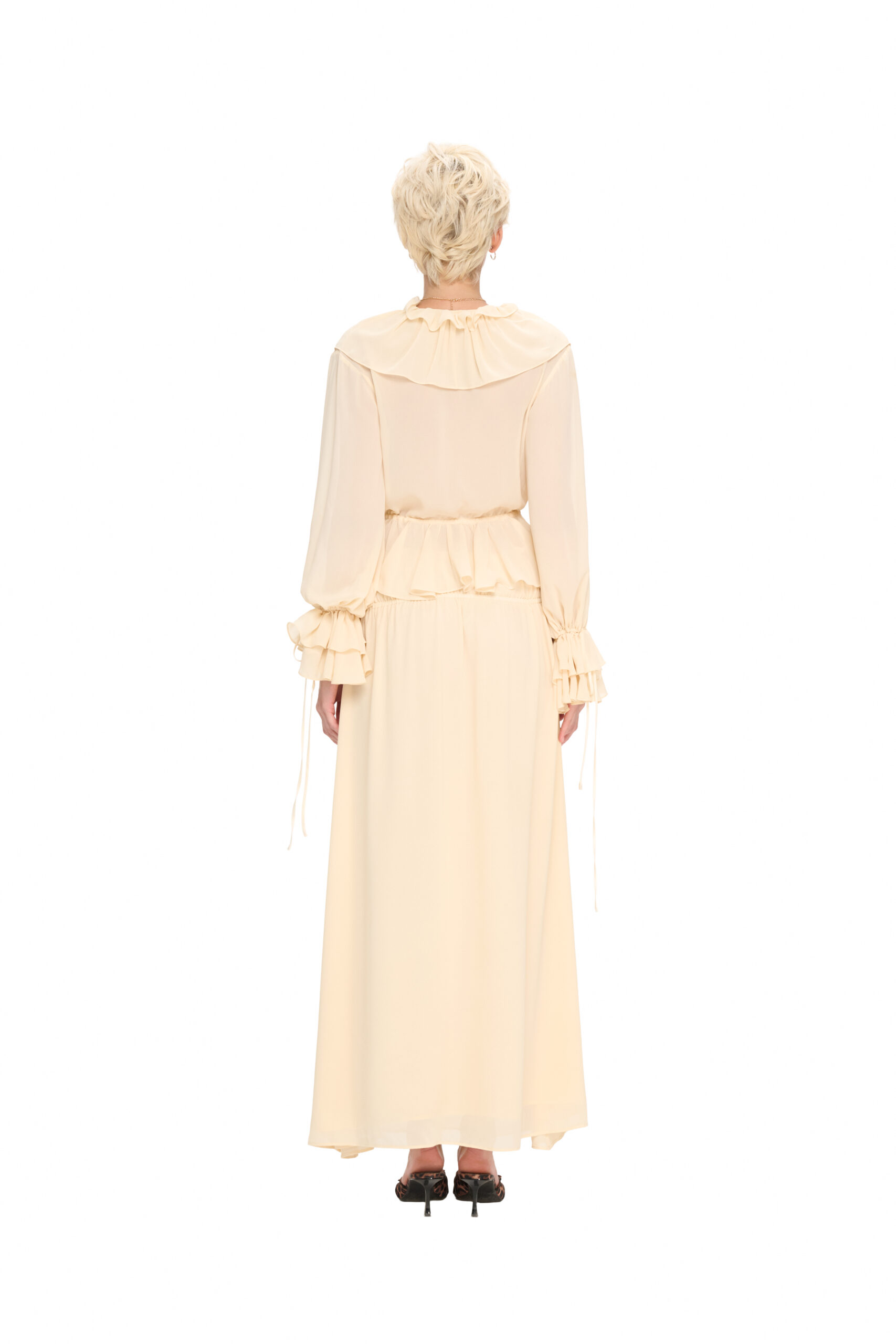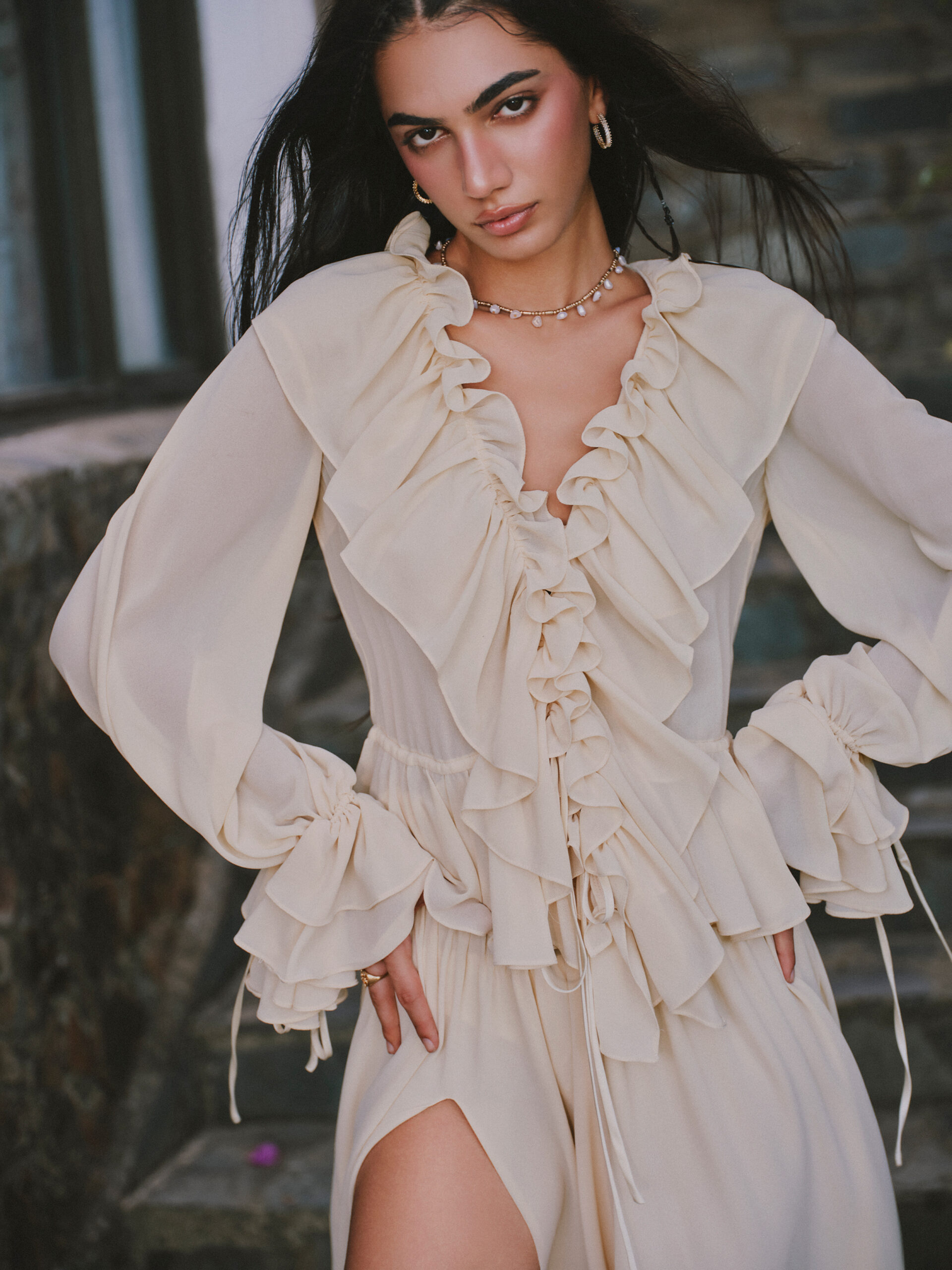 Sleeves stand out with two layers of refined ruffles, adding grace to the outfit.