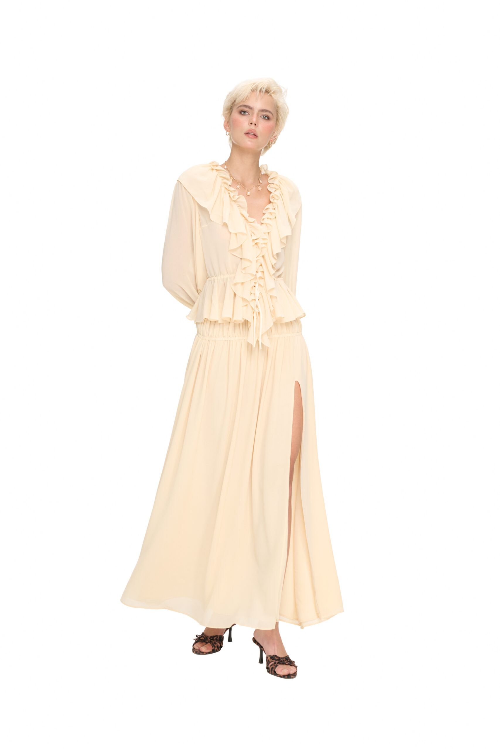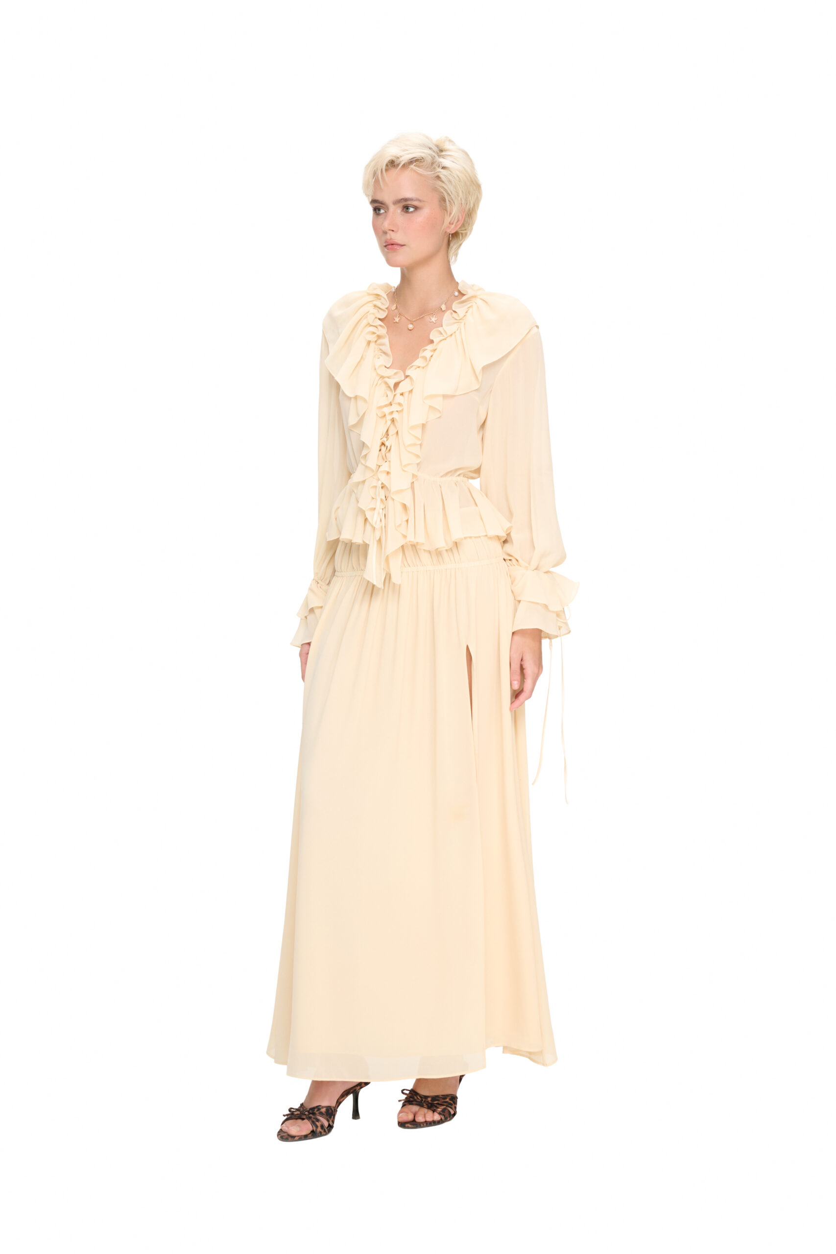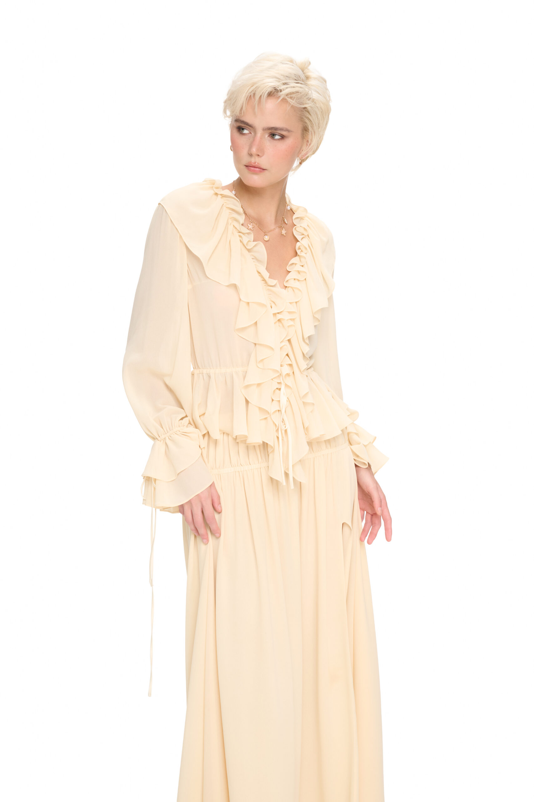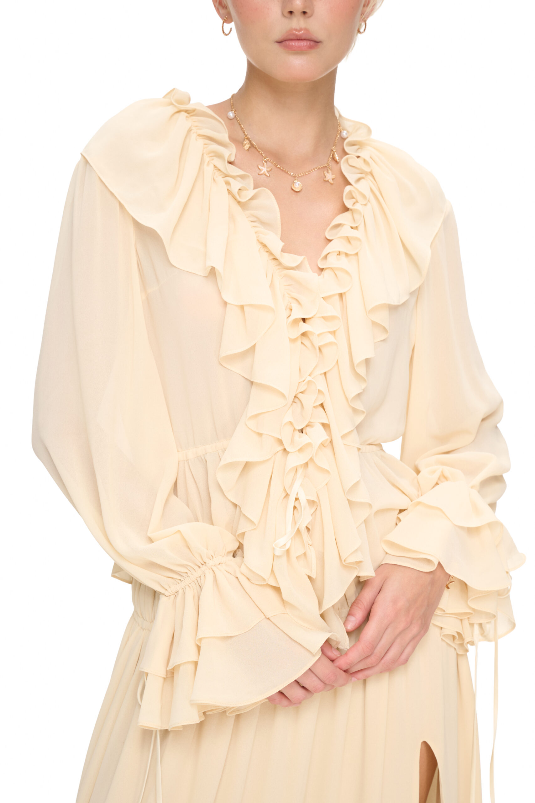 Opal long top made from chiffon, featuring feminine ruffle details.